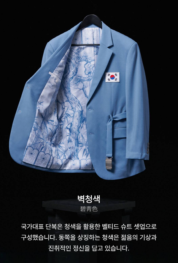 단체복은 전통 관복의 '각대'를 재해석한 벨트 포인트가 돋보이는 디자인입니다.