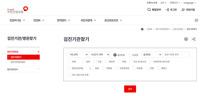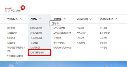 검진기관 검색: 국민건강보험공단 홈페이지 메인에서 '건강 in' 탭을 클릭하고 '검진기관/병원 찾기'를 선택합니다.