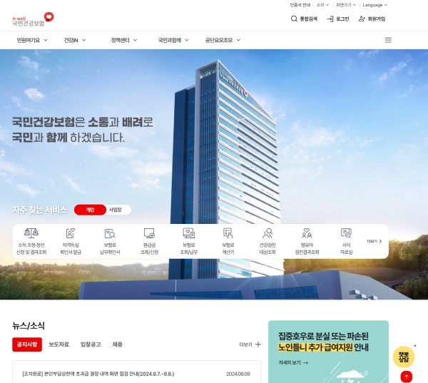 국민건강보험공단 홈페이지 접속: 먼저, 국민건강보험공단 홈페이지에 접속한 후 로그인을 합니다.