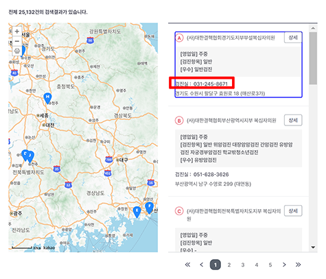 병원 선택: 조회된 병원 중 원하는 병원을 선택하고, 해당 병원의 '상세'를 클릭합니다.