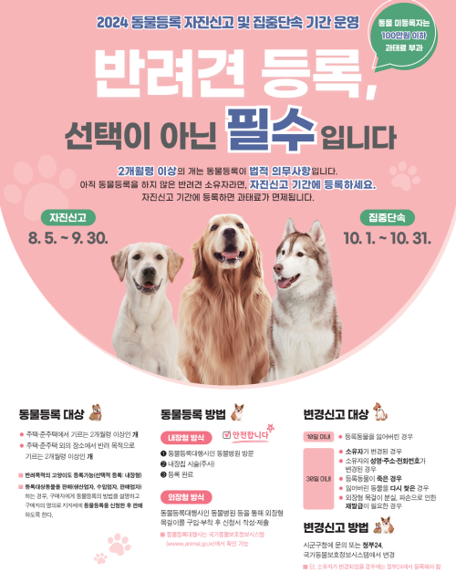 반려견 등록 자진신고 기간 : 2024. 8. 5 ~ 9. 30