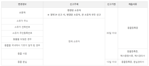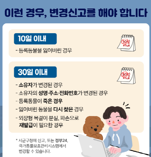 이러한 변경사항이 발생하면 반드시 30일 이내에 신고를 해야 하며, 반려견을 잃어버린 경우에는 10일 이내에 신고해야 합니다.