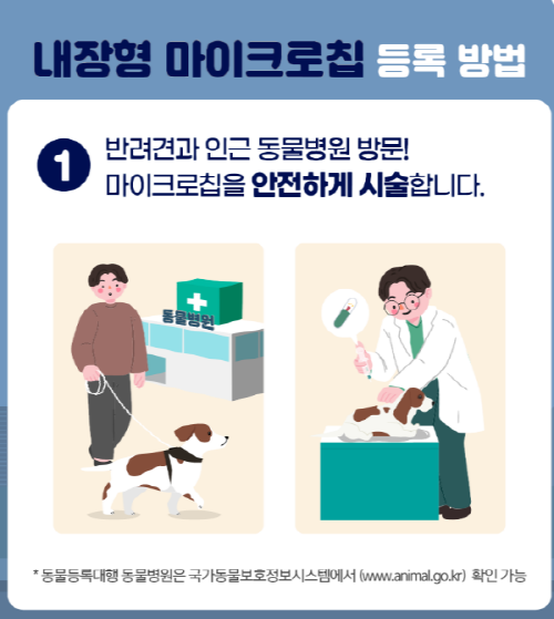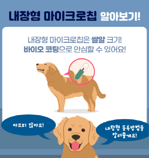 쌀알 크기의 작은 칩이 반려견의 피부 아래에 삽입되며, 이를 통해 반려견의 등록 정보를 확인할 수 있습니다.
