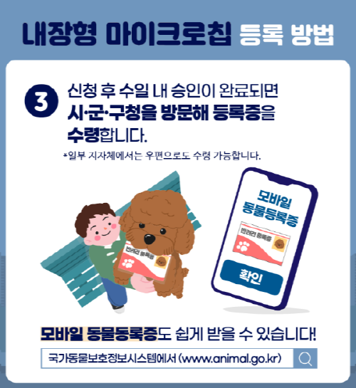 반려견 등록을 위한 내장형 마이크로칩은 훼손이나 분실의 우려가 적고, 반려견이 유실되었을 때 가장 신속하게 되찾을 수 있는 방법입니다.