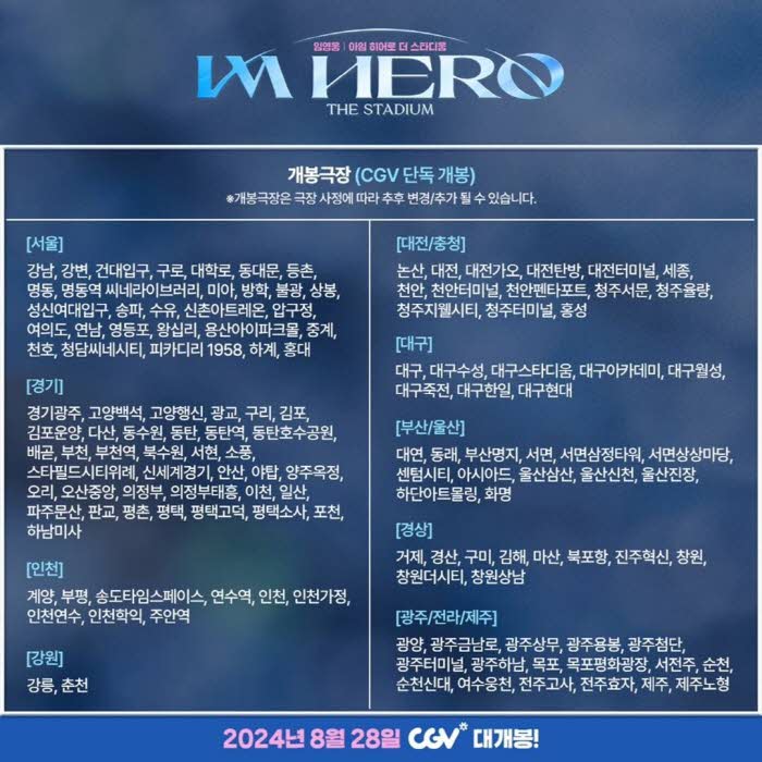 이번 임영웅 영화 '아임 히어로 더 스타디움'은 CGV에서 단독으로 상영합니다.