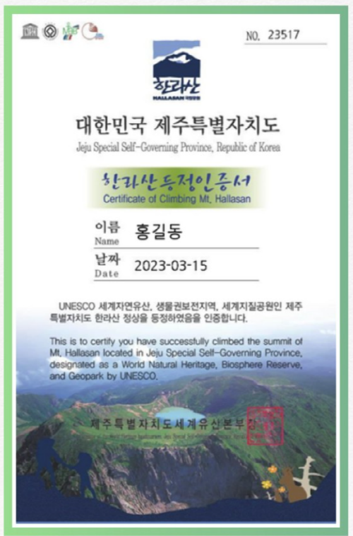 한라산 등정 인증서는 한라산 정상(백록담)에 오른 탐방객들이 등정의 성취를 기념하기 위해 받는 공식적인 인증서입니다.