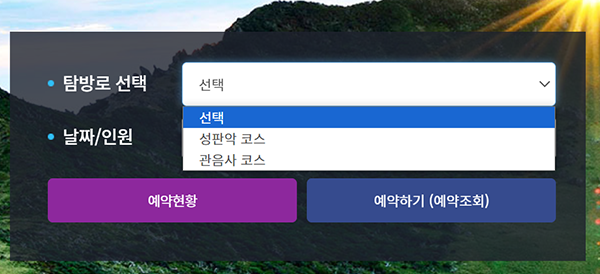 2) 탐방로 2군데중 한곳을 선택하고 날짜와 인원을 선택하고 [예약하기]를 눌러줍니다.