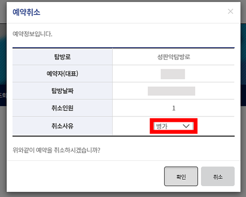예약취소 팝업이 뜨는데 취소사유를 선택해 주고 [확인]을 눌러줍니다.