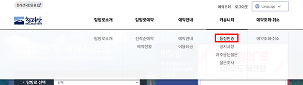 1) 홈페이지 상단 '커뮤니티 > 등정인증' 메뉴를 선택합니다.