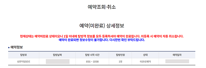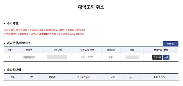 예약한 후에 취소 없이 탐방을 하지 않으시면 탐방예약이 제한되니 미리 취소하셔서 패널티를 받지 않도록 조심하셔야 합니다.