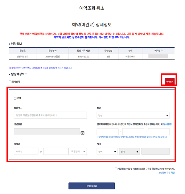 개인정보 수집 확인에 체크를 해 주시고 [예약완료하기] 버튼을 눌러주시면 됩니다.